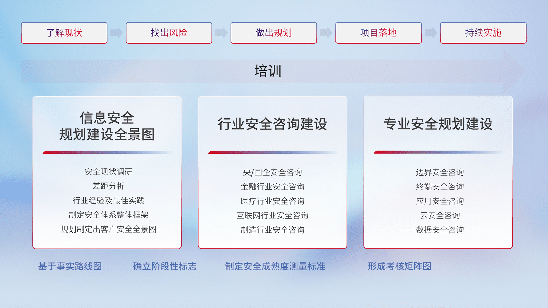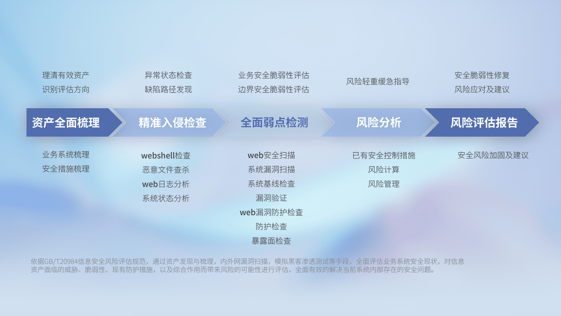 针对客户行业特性,,以专业的安全服务+多厂商联合解决方案提供专属的一站式安全管理服务,,,帮助客户全面感知网络空间威胁,,,基于识别、、、、检测、、、分析、、、防护、、监测、、响应的服务理论模型,,,从方案咨询、、、集成交付、、、评估验证、、、、优化加固、、、、运维运营,,,致力于为客户提供完整的闭环管理式安全服务。。以实战经验为客户打造高抵御风险的安全体系,,,帮助客户发现威胁、、、、对抗威胁、、、、处置威胁,,,,不断积累安全对抗能力,,,,持续保障数字化安全。。
